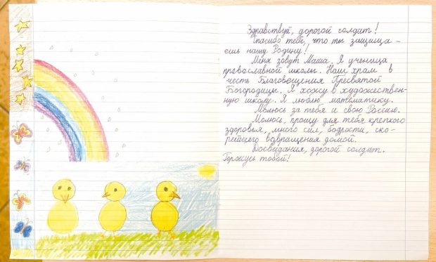Мы собираем детские письма, рисунки в специальные коробки у стендов с изображением Ангела - для последующей отправки нашим бойцам на фронт. Мы рады любым письмам: написанным здесь же, после просмотра кинофильмов, дома, в семьях, а также на приходах, в школах и классах на организованных педагогами уроках мужества!